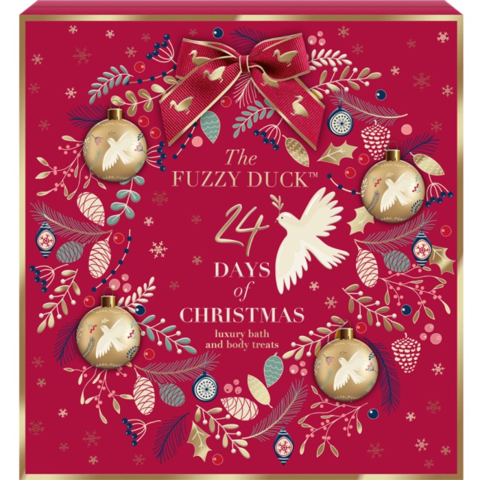 Kalendern innehåller en blandning av kroppsprodukter med julinspirerade dofter som är en del av säsongens festligheter - plommon, tranbär, äpple och kryddat päron - badskum (5 x 2 x 30 ml kropp), (30 ml) 30 ml), fuktighetskräm (3 x 30 ml), kroppssmör (30 ml), fotkräm (30 ml), badbomb (5 x 30 ml) och badkristaller (25 g)