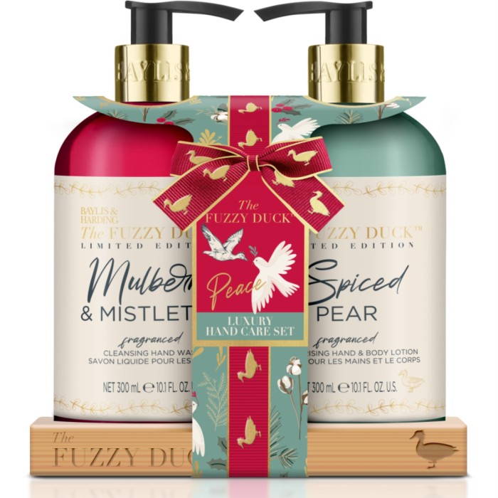 The Fuzzy Duck Winter Wonderland Hand Care Gift Set från Baylis & Harding består av en julinspirerad handtvål (300 ml) och en handkräm (300 ml). Handtvålen och handkrämen kommer på en fin träbricka, perfekt att ställa på köksbänken eller på handfatet. Kitet innehåller Mulberry & Mistletoe Hand Wash och Spiced Pear Hand & Body Lotion.