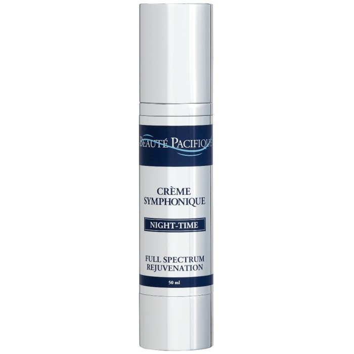 Beauté Pacifique Symphonique Night-Time är en avancerad nattkräm som innehåller sex olika typer av A-vitamin, och är framtagen för att ge en omedelbar reparation av kollagennätverket och ha en antiage-effekt. Symphonique Night-Time har också en förebyggande effekt genom att huden får en depå av A-vitaminer. Det fungerar genom Beauté Pacifiques patenterade squalanebaserade nanoteknik som kan transportera de olika typerna av A-vitamin ner i djupare hudlagren. Detta kan bidra till att stärka det elastiska fibernätverket och göra att huden ser yngre ut. Symphonique Night-Time nattkräm är aktiv hela natten tack vare fördröjd frisättning av innehållsämnena.