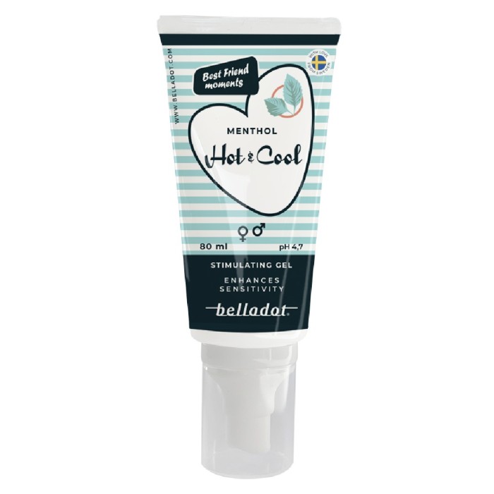 Belladot Hot & Cool Menthol Gel är en gel speciellt utvecklat för intima stunder. När du masserar med Hot & Cool ökar blodet i svällkropparna vilket ger en pulserande värmande känsla samtidigt som gelen verkar kylande mot huden. En liten droppe räcker för att väcka leklusten. Hot & Cool Menthol Gel kan användas även på bröstvårtorna eller vid oralsex. Har en svag doft av mentol och är mild mot den känsliga huden i underlivet. pH på 4,7. Går bra att använda ihop med kondom. Innehåller sötningsmedlet stevia.