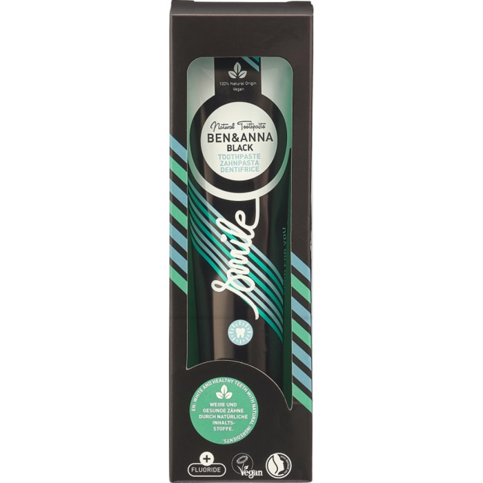 Ben & Anna Toothpaste Black är en tandkräm med aktivt kol som tar bort missfärgningar på tänderna. Tandkrämen har den fluorhalt som rekommenderas av Sveriges tandläkarförbund (1450 ppm F-) och bidrar till friska tänder och en fräsch andedräkt. Innehåller natriumfluorid som stärker emaljen och minskar uppkomsten av hål.