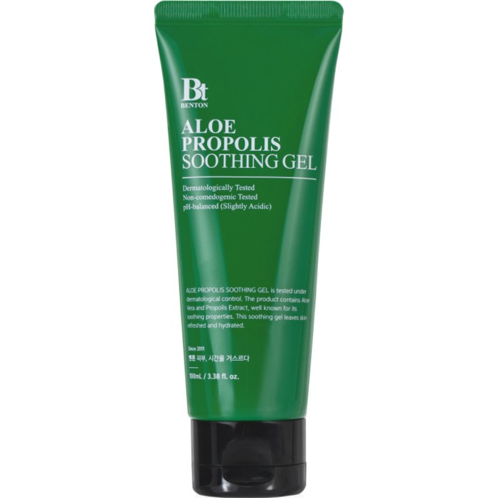 Benton Aloe Propolis Soothing Gel är en aloe vera-gel som innehåller propolisextrakt som effektivt lugnar och återfuktar huden. Propolis används i hudvårdsprodukter för att vårda hud med blemmor och dämpa rodnad i huden. Gelens huvudingredienser är aloevera-juice som svalkar huden; propolis som verkar rengörande och lugnande; och allantoin som mjukgör och lugnar huden.