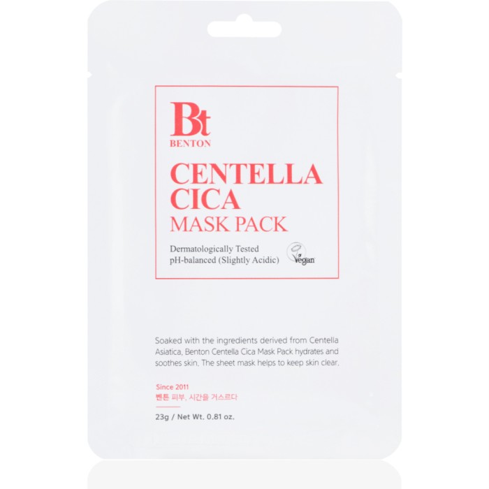 Benton Centella Cica Mask är en ansiktsmask framtagen för att lindra stressad hud. Denna svalkande sheet mask är baserad på 45% extrakt av centella asiatica, en populär ingrediens i koreansk hudvård, som mjukgör och lugnar huden samtidigt som den återfuktar huden med hyaluronsyra. Innehåller även extrakt av tea tree. Centella Cica ansiktsmask har ett något surt pH-värde på 6 för att balansera hudens naturliga pH-värde. Passar alla hudtyper, även känslig hud.