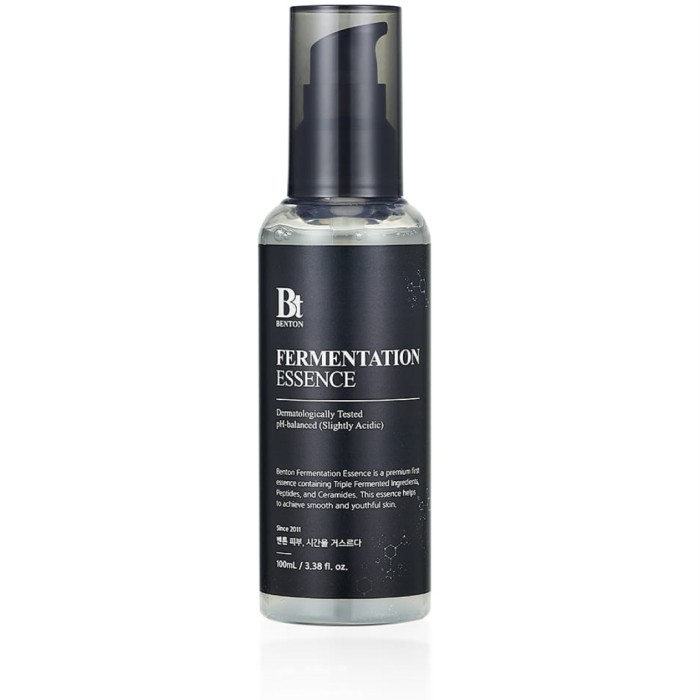 Benton Fermentation Essence används innan serum och ansiktskräm för att stärka hudbarriären och jämna ut hudtonen. Essensen är baserad på 80% galactomyces, en biprodukt som uppstår vid fermentering av ris och är en populär ingrediens inom asiatisk hudvård. Galactomyces är rik på vitaminer och antioxidanter och används för att hjälpa till att stärka hudbarriären, jämna ut hudtonen och förbättra hudens textur genom att förminska porernas utseende och reglera talgproduktionen. Vid regelbunden användning kan huden upplevas klarare, mer balanserad och att huden får ökad lyster. Benton Fermenation Essence innehåller Bifida ferment lysate, som är en typ av probiotika.