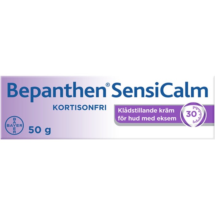 Bepanthen SensiCalm är en kräm som lindrar torrhetsklåda och stimulerar återuppbyggnad av hudbarriären, vilket minskar behovet att klia. Bepanthen SensiCalm innehåller naturligt vårdande lipider som påminner om lipidlagren i hudbarriären. Bepanthen SensiCalm kan användas av vuxna, barn och spädbarn. Krämen är lätt att stryka på utan att kladda och den kan användas i ansiktet.
