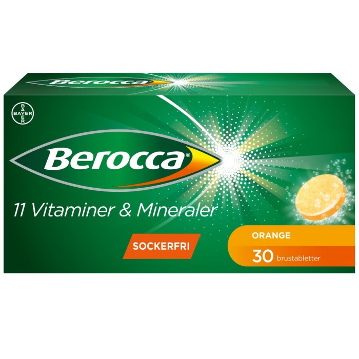 Berocca Energy Orange är en sockerfri multivitamin med apelsinsmak. Brustabletterna löses upp i vatten och innehåller en skräddarsydd blandning av 11 vitaminer och mineraler: vitamin C och alla 8 B-vitaminer samt magnesium och zink.