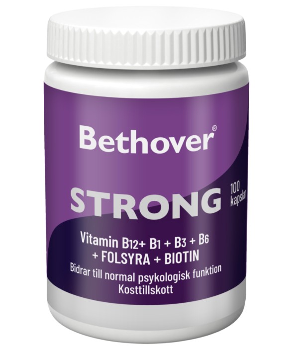 Bethover Strong är ett kosttillskott som är en kraftfull B12-vitamin, men som även innehåller ett spektrum av andra B-vitaminer. Bethover Strong innehåller främst B12 och folsyra. B12 bidrar till nervstystemets normala funktion. Innehåller andra b-vitaminer, bland annat tiamin (vitamin B1) som bidrar till normal psykologiskfunktion och niacin (vitamin B3) som bidrar till att minska trötthet och utmattning.