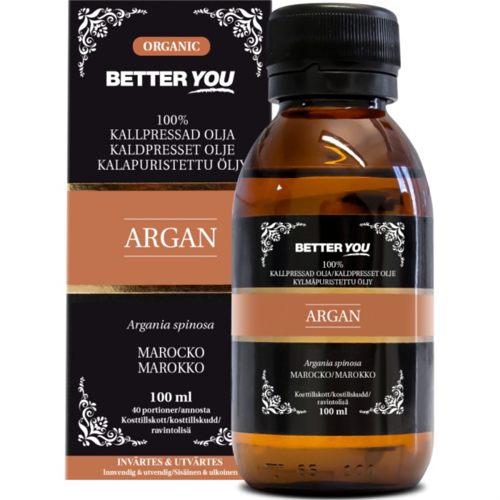 En högkvalitativ och äkta arganolja (Argania spinosa) från Marocko. Arganolja är en tunn olja som lätt tränger in i huden. Oljan har en mild och nötaktig arom och är rik på antioxidanter och näringsämnen som verkar skyddande på huden. Kan användas både till huden och håret. Kan också användas som kosttillskott.