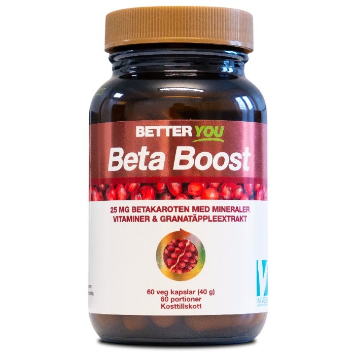 Better You Beta Boost är ett vitamin- och mineralkomplex med 25 mg betakaroten och granatäpple. Granatäpple innehåller antioxidanter, bl a ellaginsyra, och vitaminer och mineraler.