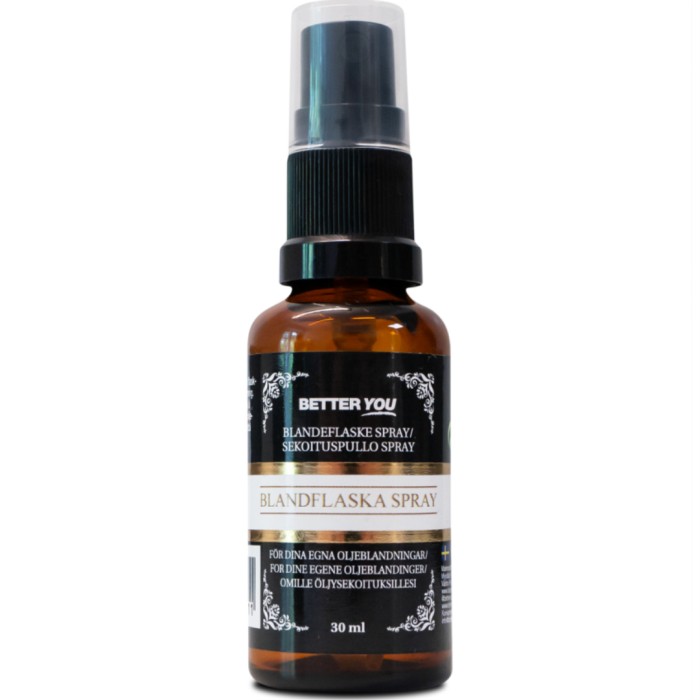 Blandflaska av glas, med spraypump, för att göra din egen oljeblandningar. Med en blandflaska kan du enkelt blanda din egen olja, och spraypumpen gör appliceringen enkel. Flaskan är tillverkad i mörkt färgat glas för att på bästa sätt bevara oljornas egenskaper.