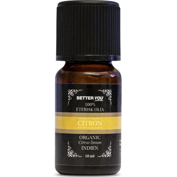 Eterisk citronolja (Citrus limon) från Indien, en olja som är kallpressad från citronens skal. Citronoljan används mest inom aromaterapi eller till parfymer, och är vanlig inom städ och tvätt då citron är rengörande och bleker ytor.