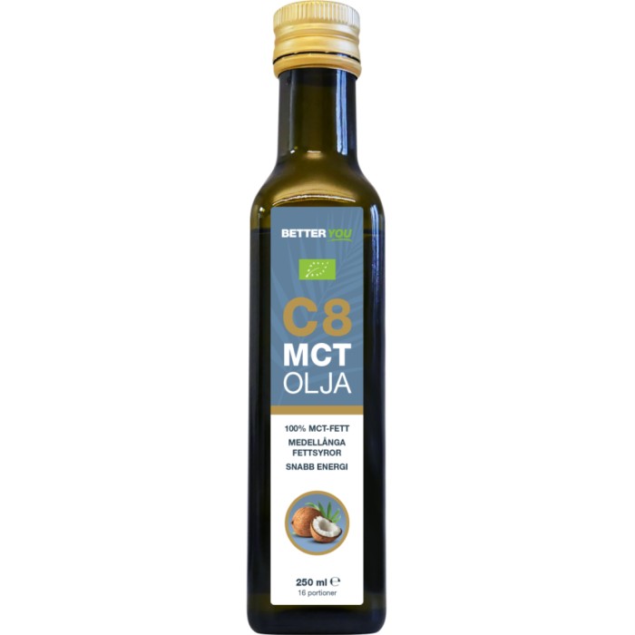 Better You C8 MCT-olja är en ekologisk olja av hög kvalitet gjord av kokosnöt. Passar dig som går på någon form av diet med lågt kolhydratsintag eller behöver snabb energi under dagen. MCT står för Medium Chain Triglycerides och är en fettsyra med kortare kedjelängd. På grund av den kortare kedjelängden absorberas och förbränns MCT snabbare en andra fettsyror och kan därför användas till energi för organ och muskler omedelbart efter intag. Det finns olika sorters MCT-olja. C8 är ett annat namn för kaprylsyra och C10 som är ett annat namn för kaprinsyra. Ofta kombineras dessa för att få en fin balans, men det är C8 som är den snabbare varianten. Ren C8 tas upp lättare av magen och kan därefter tas upp av blodet och omvandlas till energi på snabbast möjliga sätt. C8 kan därför vara den optimala fettsyran för dig som vill ha en snabb energi och passar bra kring träning eller vid en kost som är lägre på kolhydrater.