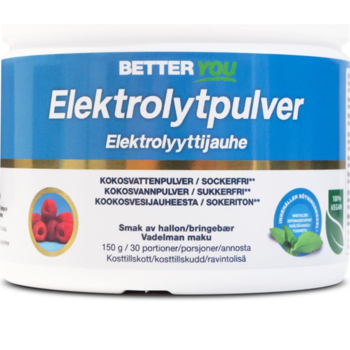 Better You Elektrolytpulver Hallon är ett elektrolytpulver som innehåller salter och mineraler för att hjälpa till att återställa vätskebalansen. Elektrolytpulvret är naturligt och passar dig som tränar och svettas mycket. För att kroppen ska kunna ta upp elektrolyterna på bästa sätt innehåller pulvret också kokosvattenpulver, som är naturligt rikt på elektrolyter. Några av de viktigaste elektrolyterna är kalcium, kalium och magnesium. Magnesium bidrar till elektrolytbalansen och till att minska trötthet och utmattning. Kalium bidrar till nervsystemets normala funktion. Kalcium bidrar till normal muskelfunktion och energiomsättning. Innehåller 0,5 g socker per 100 ml färdigblandad dryck. Innehåller sötningsmedel.