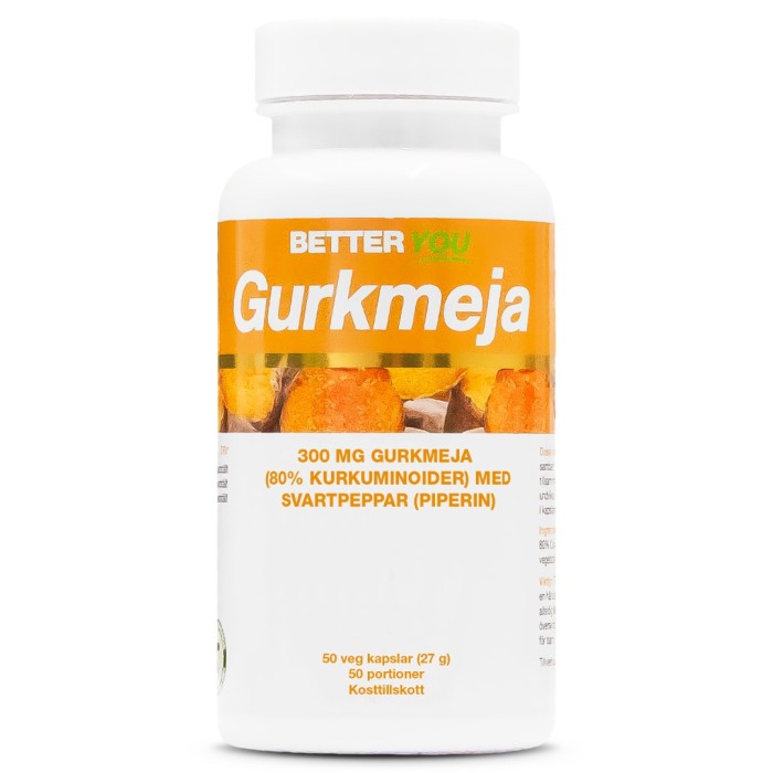 Better You Gurkmeja är ett kosttillskott med gurkmejaextrakt med svartpeppar (piperin) i vegetabilisk kapsel.