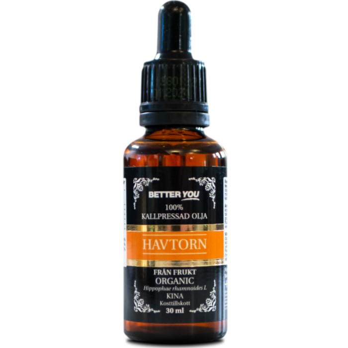 Better You Havtornsolja (Hippophae rhamnoides L) från Kina kommer från frukten från havtorn och har en fin blandning av flera omega-fettsyror, bland annat omega-7. Kan användas som ansikts- och kroppsolja. Kan även användas som kosttillskott.