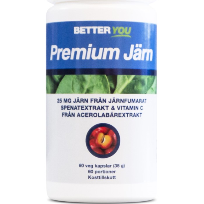 Better You Premium Järn är ett kosttillskott med järnfumarat och extra tillsatt C-vitamin för att förbättra upptaget. Premium Järn innehåller extrakt från frukten acerola som innehåller C-vitamin. Detta kosttillskott är framtaget för att vara snällt mot magen, men samtidigt ge ett extra bra upptag.