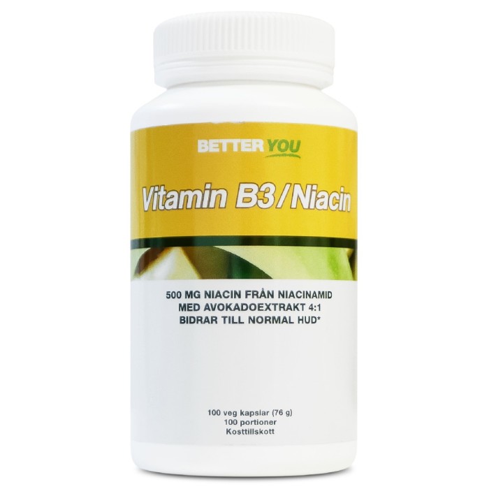 Better You Vitamin B3 innehåller formen niacinamid/nikotinamid. Utöver niacinamid har man valt att tillsätta avokadoextrakt.