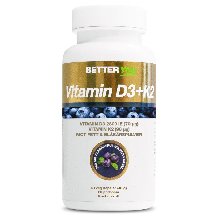 Better You Vitamin D3+K2 är ett kosttillskott som innehåller vitamin D3, vitamin K2, MCT-fett från kokos och blåbärspulver. D-vitamin bidrar till immunsystemets normala funktion och till att bibehålla normal benstomme. Dessutom bidrar det till normalt upptag/utnyttjande av kalcium och fosfor