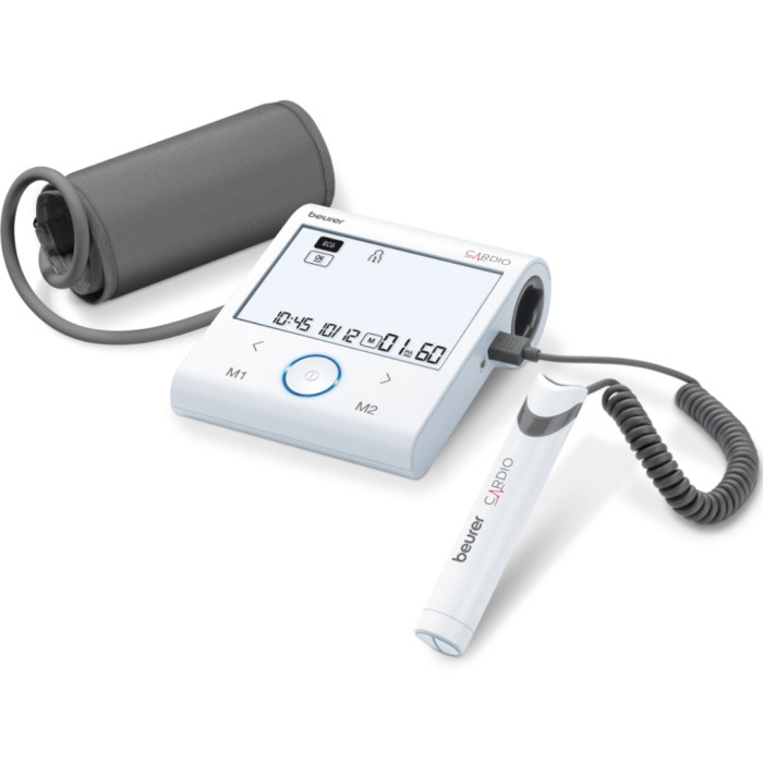 Beurer BM 96 Blodtryck/EKG är en helautomatisk blodtrycksmätare för överarm och mätning av hjärtrytm EKG. Mätaren visar systoliskt och diastoliskt tryck samt puls. Den visar genomsnittliga blodtrycksvärden för morgon och kväll de senaste 7 dagarna.