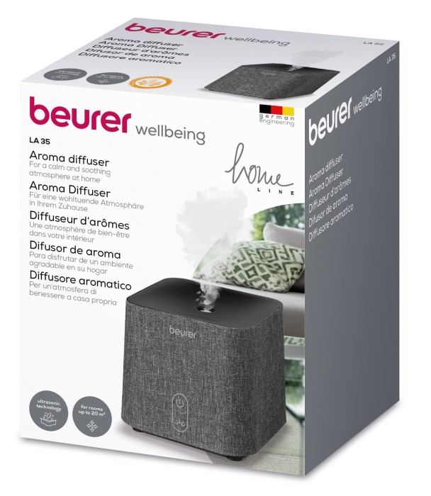 Beurer LA 35 Aroma Diffusor är en fin aromadiffusor med stilren design och ett fint tygöverdrag, designad för att skapa en rogivande atmosfär i ditt hem. Sprider en mikrofin dimma och passar för rum upp till 20 kvadratmeter. Används med vattenlösliga aromoljor (köps separat) för att sprida en doft i rummet. Är tyst och energibesparande. Har en vattenkapacitet på 120 ml och effekt på 12 watt. Stängs av automatiskt när vattentanken är tom. Diffusorn kan användas med eller utan LED-belysningen.