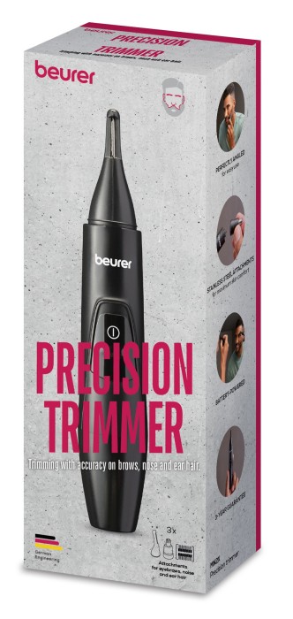 Beurer MN2X Precisionstrimmer med högkvalitativa tillbehör i rostfritt stål. Används för att, med de 3 olika tillbehören, enkelt och smidigt forma ögonbryn, och klippa näshår och öronhår. Batteridriven. 1 st 1,5 V AA-batteri ingår. Praktisk förvaringsväska samt rengöringsborste medföljer. Ej vattentät, endast stänkskyddad (IPX4).