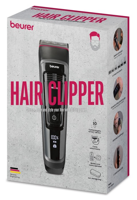 Med MNX5 hårklippare kan du klippa ditt hår hemma. Med 7 tillbehör kan du få rätt inställning för ditt hår med 6 justerbara klipplängder (3, 6, 10, 16, 19, 25 mm) och 4-stegs finjustering (0,6 till 2,4 mm). Hårklipparen har ett högkvalitativt blad i rostfritt stål för snabb och effektiv hårklippning. Det kraftfulla litiumbatteriet ger upp till 4,5 timmars drifttid på batteri, men kan också användas med nätdrift. MN5X kanske blir den perfekta följeslagaren att använda både hemma och när du är på resande fot. Förvaringsväska ingår.