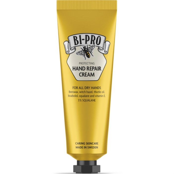 Bi-Pro Protecting Hand Repair Cream är en intensivt mjukgörande och vårdande handkräm som reparerar och lugnar huden på djupet. Krämen är baserad på en naturlig formulering med bivax, trollhassel, tistelolja, bisabolol, squalane och vitamin E. Handkrämen stärker hudens barriär och hjälper till att motverka känslig och irriterad hud. Använd på händerna vid behov. Kan med fördel användas som skydd före och efter kontakt med vatten. Bi-Pro handkräm tillverkas i Sverige.