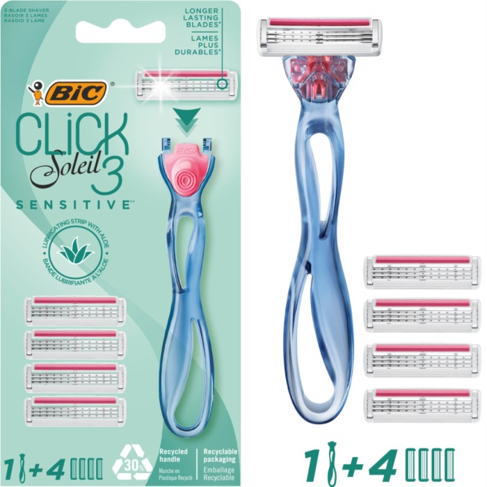 BIC Soleil Click3 Sensitive är en rakhyvel för kvinnor. Förpackningen innehåller ett handtag (som består till 30 % av återvunnen plast) och fyra rakbladsrefiller med trippelblad. Det rörliga huvudet följer kroppens kurvor och har en "guardbar" i gummi som sträcker huden för att förbereda håren för bladen. Har även en återfuktande remsa med aloe vera för en smidigare rakning. BIC Click 3 Soleil Sensitive har ett fint kurvat, blått handtag.
