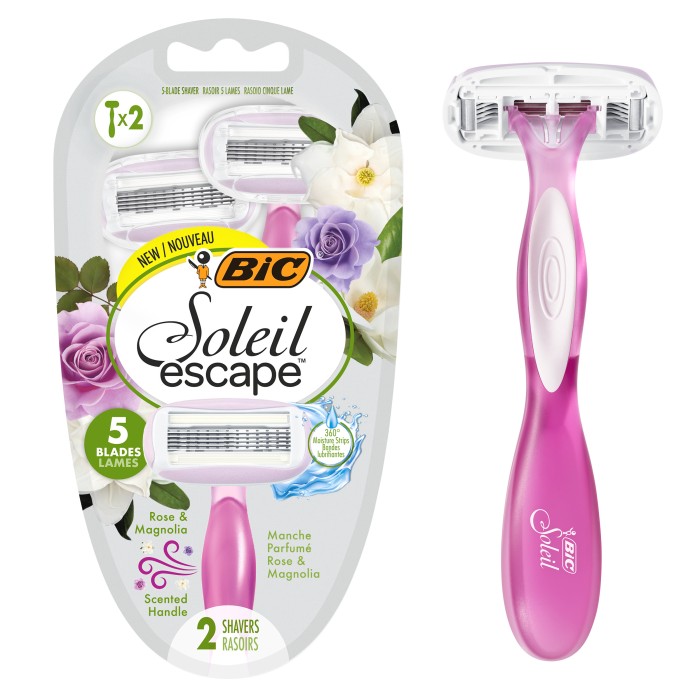 BIC Soleil Escape Rose & Magnolia är en rakhyvel med fem rörliga blad och ett rörligt huvud som följer kroppens konturer. Rakhyveln har ett gummerat handtag för att ge ett bättre grepp. En vattenaktiverad fuktremsa med mandelolja ger förbättrat glid. Handtaget har en doft av ros och magnolia. 2-pack.