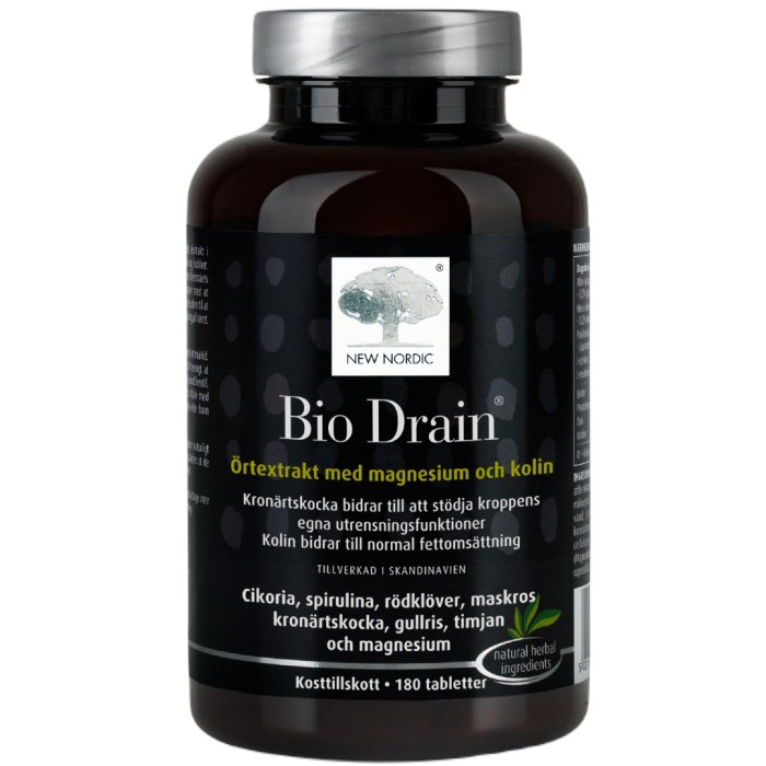 Bio Drain från New Nordic är ett örtbaserat kosttillskott som innehåller bland annat cikoria, spirulina, kronärtskocka och mariatistel. Bio Drain innehåller kolin som bidrar till normal fettomsättning.