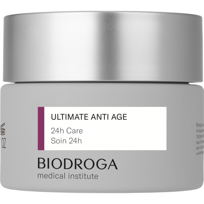 Biodroga MI Ultimate Anti-Age 24h Care är en ansiktskräm med den senaste generationen av aktiva komplex bestående av tre biopeptider och extrem lågmolekylär oligohyaluronsyra vilka främjar kollagensyntesen, stödjer aktiviteten hos hudcellerna och stimulerar cellförnyelsen. Ett anti-age-koncept som har en reducerande effekt på rynkor, ger fastare konturer, mer fyllighet och förbättrad elasticitet. Krämen har en lätt konsistens och absorberas snabbt i huden och gör att huden får lyster och känns jämn. Lämplig för alla stadier av hudens åldrande. En anti-agekräm för 30+.