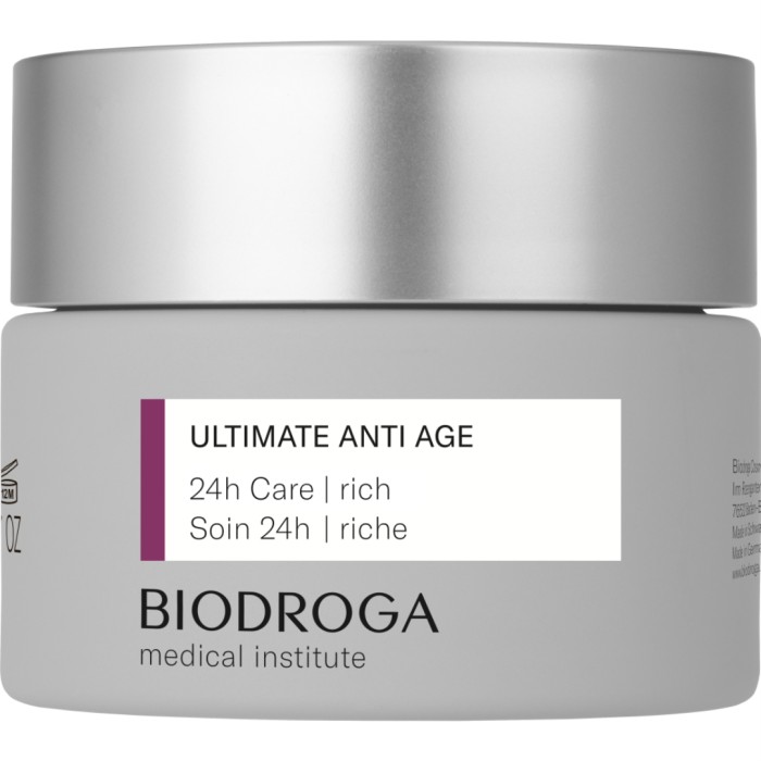 Biodroga MI Ultimate Anti-Age 24h Care Rich är en 24timmars-kräm med den senaste generationen av aktiva komplex bestående av tre biopeptider och extrem lågmolekylär oligohyaluronsyra . Ansiktskrämen är framtagen för att främja kollagensyntesen, stödja aktiviteten hos hudcellerna och stimulera cellförnyelsen. Ett ultimat anti-age-koncept som har en minskade effekt på rynkor, ger fastare konturer, mer fyllighet och förbättrad elasticitet. Biodroga Medical Institute anti-age-kräm har en lipidrik konsistens som balanserar en torr hud och gör att huden får lyster.