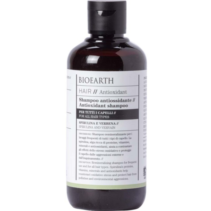 Bioearth Hair 2.0 Antioxidant Shampoo är ett hårschampo för alla hårtyper som passar för frekvent användning. Antioxidant Shampoo innehåller spirulinaproteiner, vitaminer, mineraler och antioxidanter för att bidra till att skydda håret mot oxidativ stress och föroreningar och andra skadliga miljöeffekter.