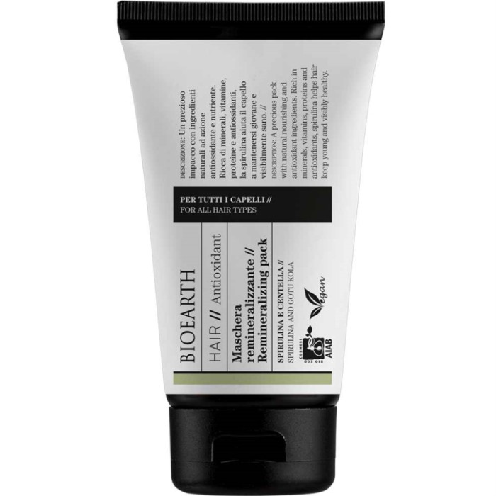 Bioearth Hair 2.0 Remineralizing Pack är en närande intensivbehandling för alla hårtyper som bidrar till ett välmående hår. Hårinpackningen innehåller spirulina samt eteriska oljor från verbena och lavendel som tillsammans med extrakt av moringa skyddar håret. Bioearth Remineralizing Pack innehåller extrakt av blåstång och kardborre för deras rengörande egenskaper.