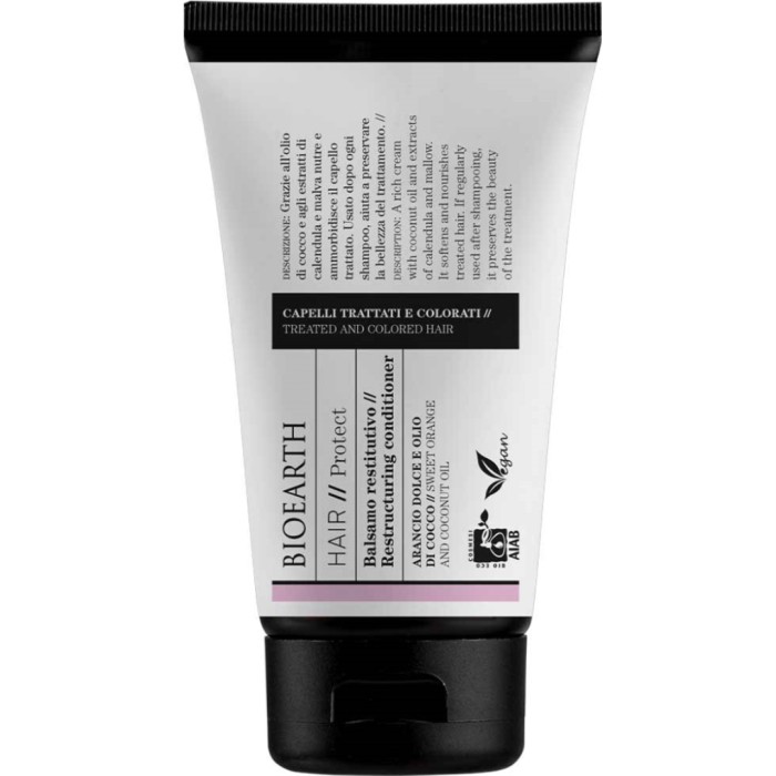 Bioearth Hair 2.0 Restructuring Conditioner är ett hårbalsam som skyddar och ger näring till behandlat och färgat hår. Balsamet innehåller kokosolja, extrakt av ringblomma och malva och bidrar till att förlänga effekten av behandling av håret.