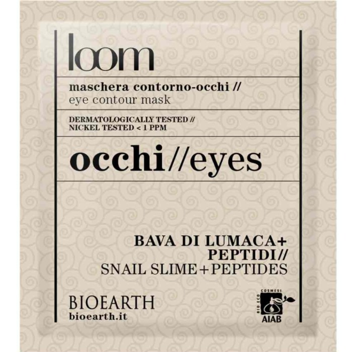 Loom Eye Contour Mask från Bioearth är en sheetmask som fräschar upp huden under ögonen. Ögonmasken har en återfuktande och uppstramande effekt, och efter användning får huden en ökad spänst och fukt. Loom Eye Contour Mask innehåller snigelextrakt (96%), peptider, hyaluronsyra, blåbärsextrakt och kamomillextrakt.