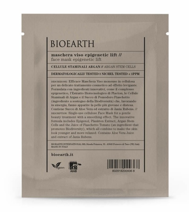 Bioearth Sheetmask Epigenetic Lift är en utjämnande och uppstramande sheetmask med avancerade ingredienser för mogen hy. Masken innehåller ett epigenetiskt komplex med bioteknologiskt planktonextrakt, stamceller från argan och juice från Fiaschetto-tomat. Ingredienserna samverkar för att göra huden mer avslappnad för att huden ska upplevas som yngre.