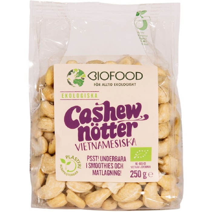 Biofoods vietnamesiska cashewnötter är hela cashews som är goda att använda i allt från maträtter, till smoothies och desserter - och om du vill göra egen cashewnötsmjölk. Cashewnötterna är såklart också goda att äta som de är som en snack.