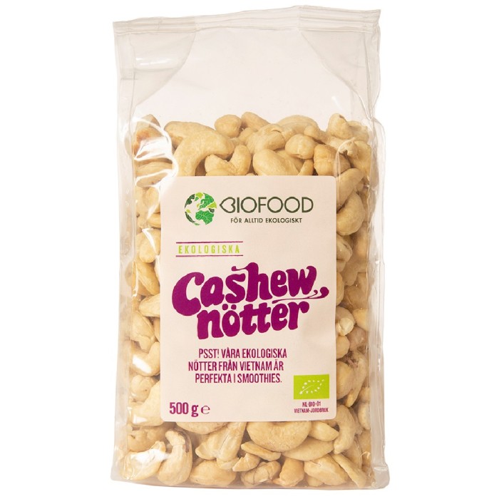 Biofoods cashewnötter kommer från ekologiska odlingar i Binh Phuoc-provinsen i Vietnam. Cashewnötter passar bra i matlagning och kan användas i allt från maträtter, smoothies och desserter till att göra egen cashewnötsmjölk. De såklart också ätas som de är, som en snack.