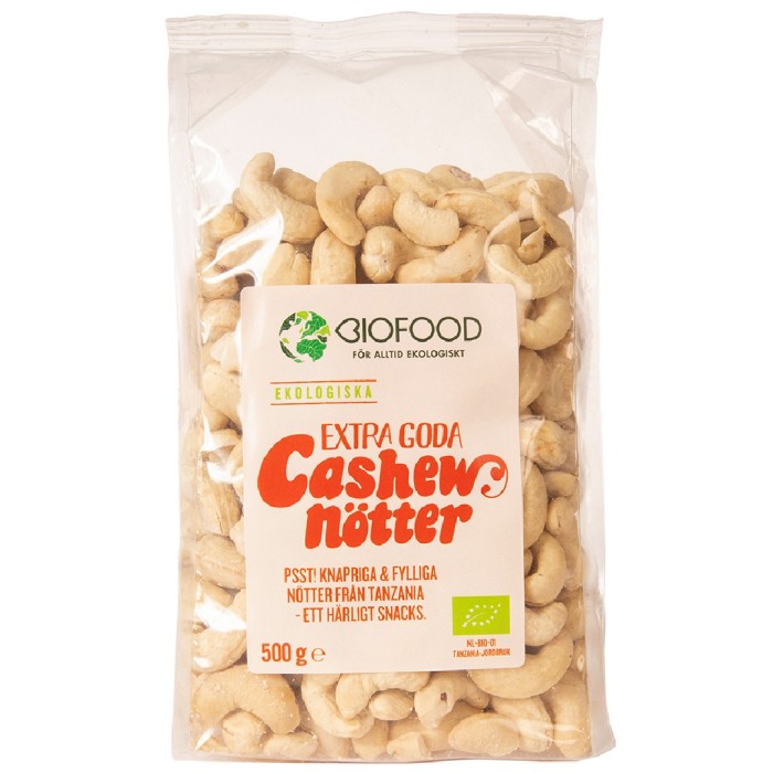 Biofoods extra goda cashewnötter kommer från Tanzania och är härligt knapriga med en len och fyllig smak. Nötterna är godast att mumsa på som de är, som en snack, men kan såklart också användas till att förhöja dina maträtter och bakverk.
