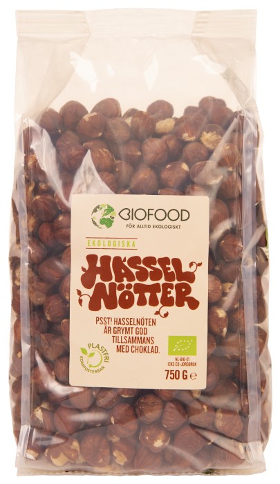 Biofoods ekologiska hasselnötter har en knaprig, fyllig och intensivt nötig smak. Hasselnötter går bra att använda i söta och salta maträtter och som ingrediens i müsli och granola eller till bakning (speciellt tillsammans med choklad) och andra sötsaker. Prova gärna att baka rustika bröd med hasselnötter!