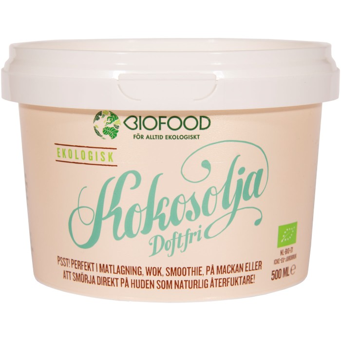 Biofoods doftfria kokosolja tillverkas av färska kokosnötter från ekologiska odlingar. Torkad kokosnötråvara, så kallad kopra, kallpressas och deodoriseras. Deodorisering är en process där vattenånga trycks igenom oljan vilket ger den en neutral smak, detta är en upphettning av oljan.