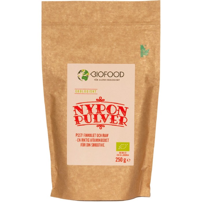Biofoods ekologiska nyponpulver är finmalt och raw och kan användas för att näring och smak till en smoothie eller till yoghurten. Pulvret tillverkas av nypon som varsamt torkats och sedan malts till ett härligt orangefärgat pulver.