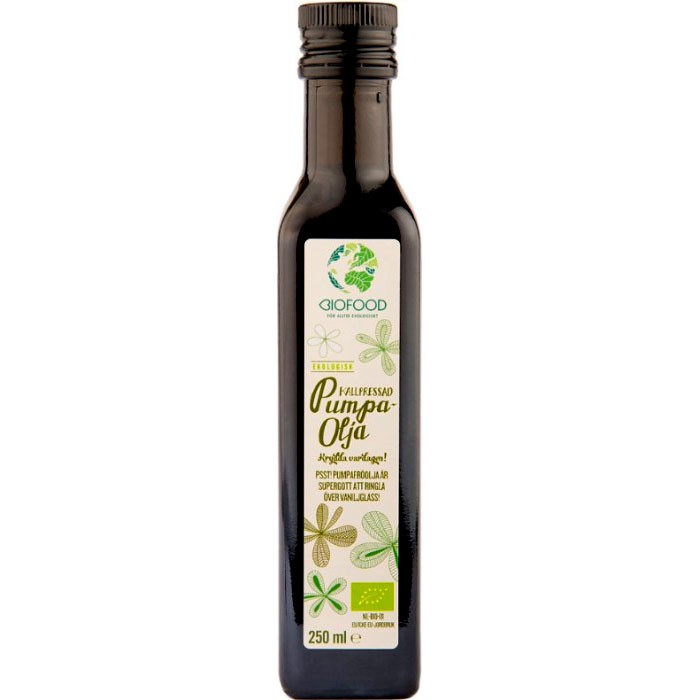 Biofoods ekologiska och kallpressade pumpafröolja är en vegetabilisk matolja som är god att ringla över en sallad. Oljan är känslig för all upphettning så den ska främst användas till kalla rätter, men är även god i bakverk.