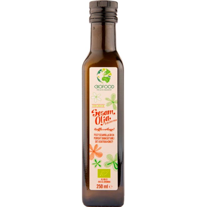 Biofoods sesamolja är gjord på ekologiska sesamfrön och är kallpressad.