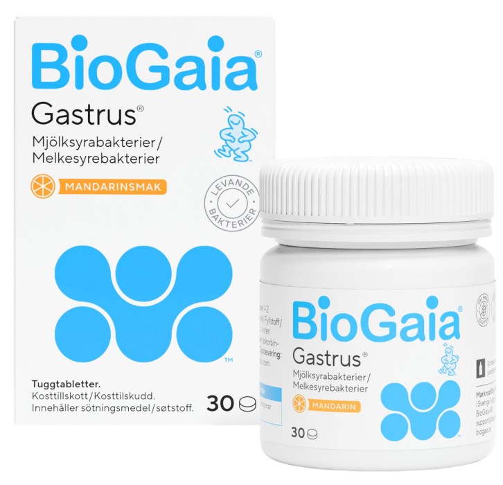 BioGaia® Gastrus® är ett kosttillskott som innehåller de patenterade mjölksyrabakterierna Limosilactobacillus reuteri Gastrus® (L. reuteri DSM 17938 och L. reuteri ATCC PTA 6475). L. reuteri Gastrus har testats i kliniska studier och är bevisad att överleva i magtarmkanalen.BioGaia ar ett svenskt innovativt hälsoföetag med mer än 30 års erfarenhet inom kosttillskott med mjölksyrabakterier. Förpackningen innehåller 30 st tuggtabletter med smak av mandarin.