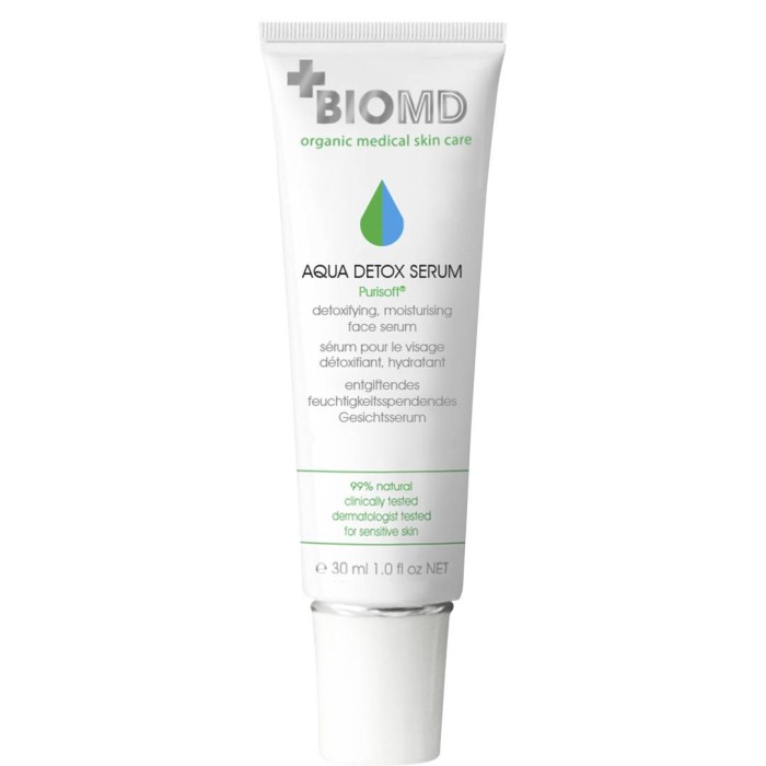 BioMD Aqua Detox Serum är ett ansiktsserum som återfuktar och "detoxar" huden. Serumet hjälper huden att bibehålla sin fuktbalans. Serumet innehåller naturlig citronsyra som verkar utjämnande, löser upp igentäppta porer och gör huden mjuk och klar.