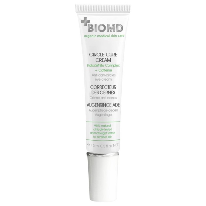 BioMD Circle Cure Anti Dark-Circles Cream är en ögonkräm framtagen för att motverka mörka ringar under ögonen. Krämen innehåller HaloxWhite Complex, som består av kliniskt testade, aktiva ingredienser för att neutraliser periorbital pigmentering och dämpa violett färg. Med koffein som motverkar svullnad i huden under ögonen.
