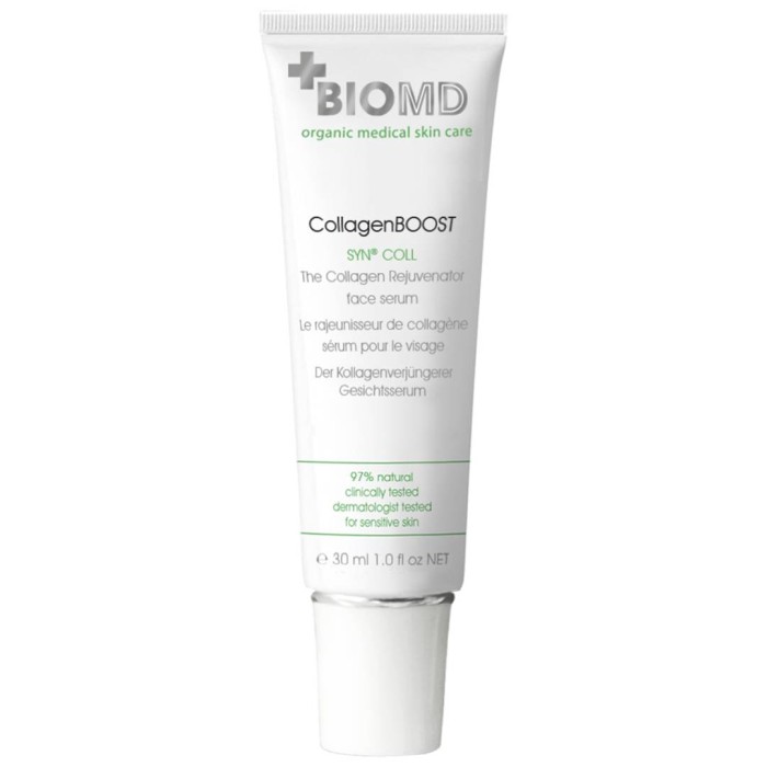 BioMD Collagen Boost är ett ansiktsserum med antiage-effekt för hud med åldertecken. Serumet innehåller den aktiva ingrediensen SYN®COLL för att göra rynkor mindre synliga. Collagen Boost jämnar ut huden och förfinar porerna och bidrar till hudens elasticitet och textur genom att motverka att kollagenet i huden bryts ned.