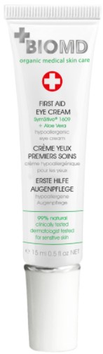 BioMD First Aid Eye Cream är en hypoallergen ögonkräm framtagen för att lugna och återfukta den känsliga huden runt ögonen. Ögonkrämen innehåller den aktiva ingrediensen SymSitive® 1609 som kan bidra till att minska besvär hos hypersensitiv hud såsom en brännande eller stram känsla i huden. Med aloe vera som har en svalkande och återfuktande effekt.